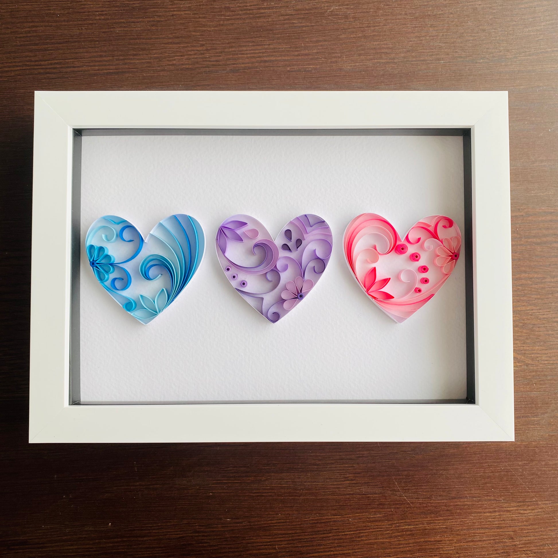 Original piece of quilling art that makes a great gift. Each piece is made to order so the hearts can be in the colours of your choice.