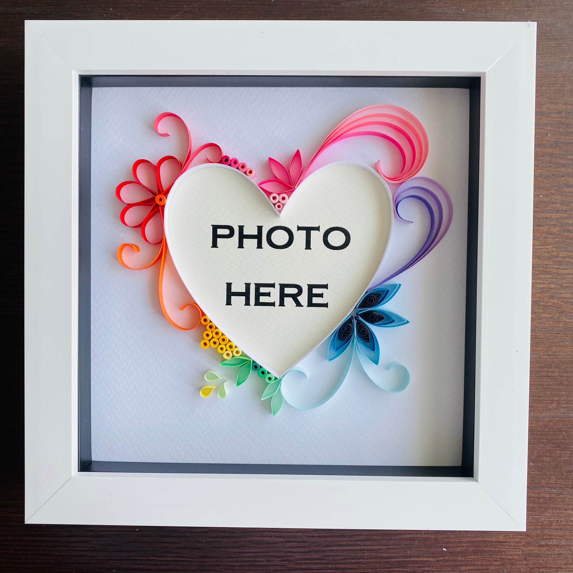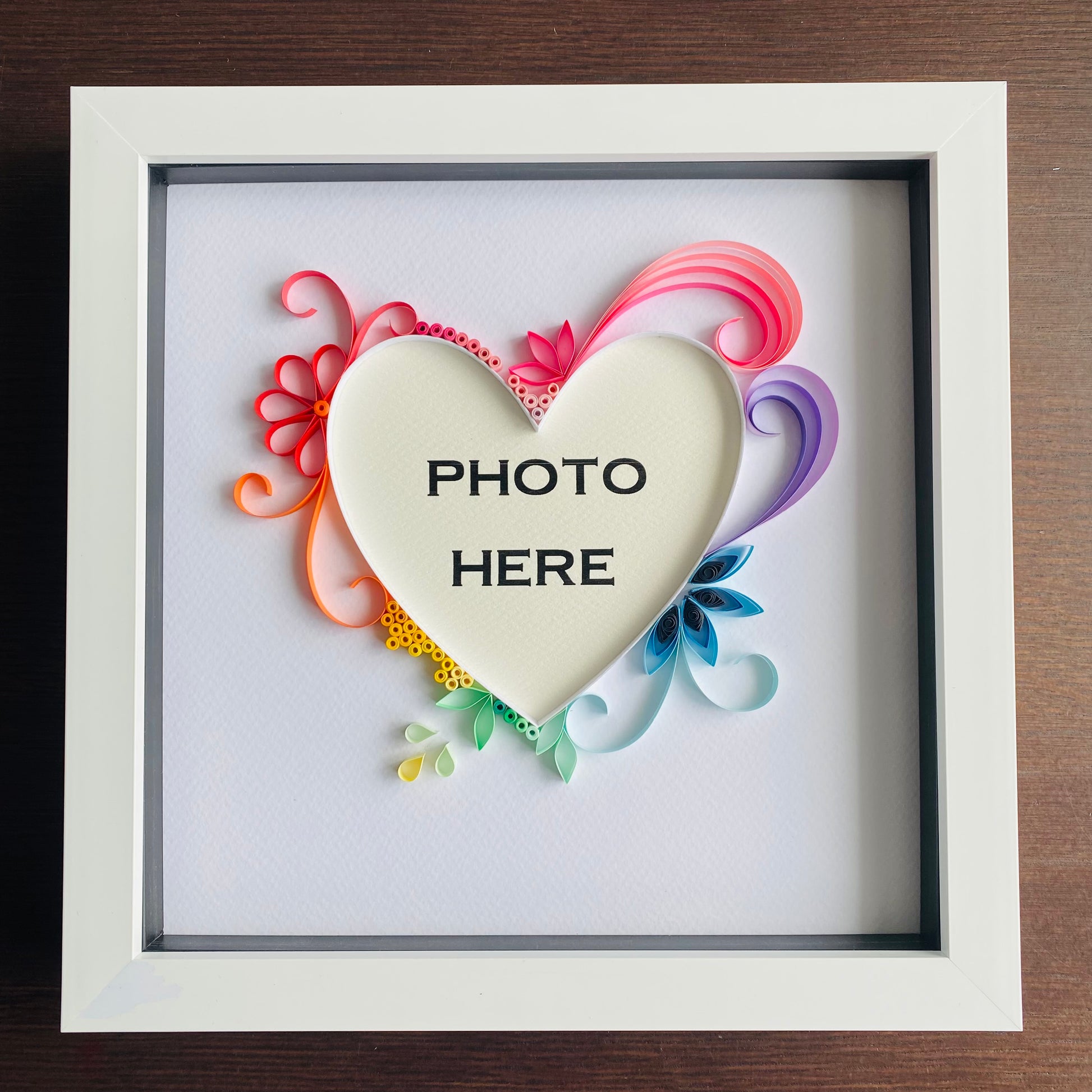 Rainbow quilling art photo frame that makes a great gift.