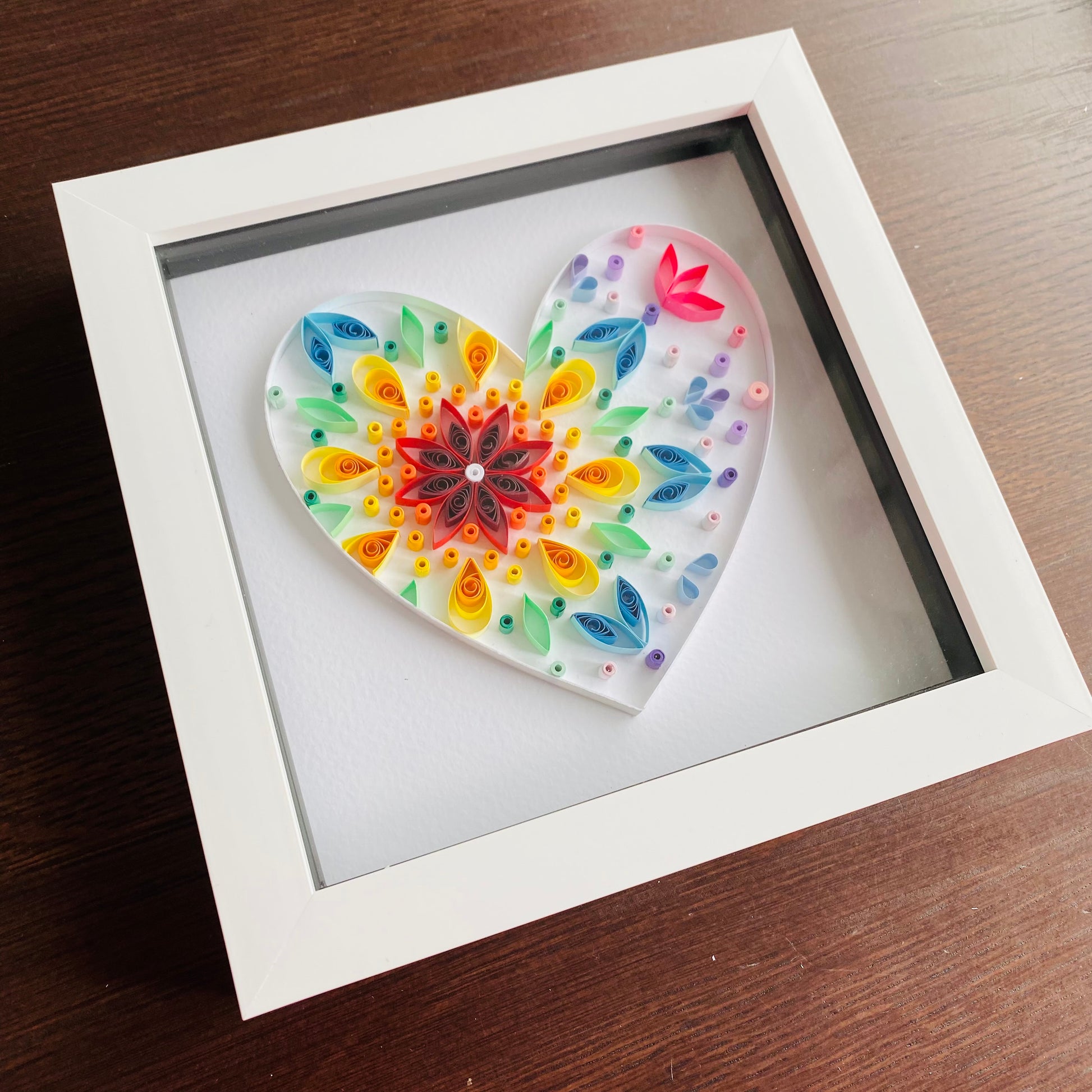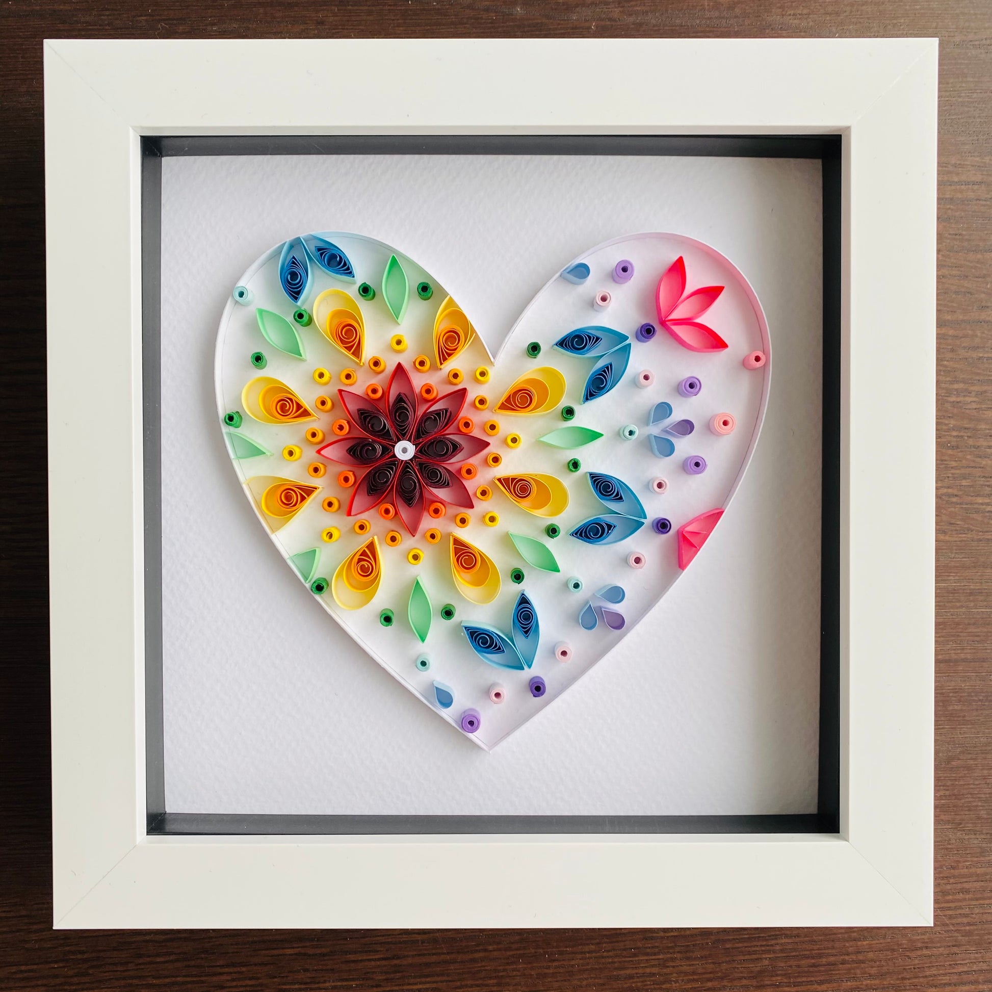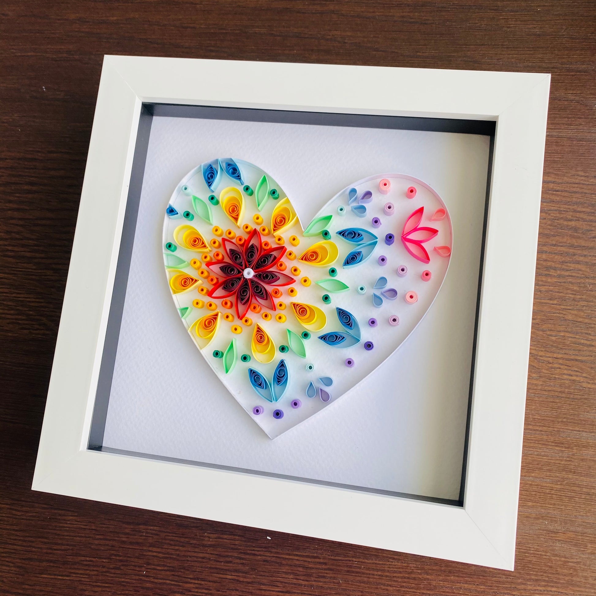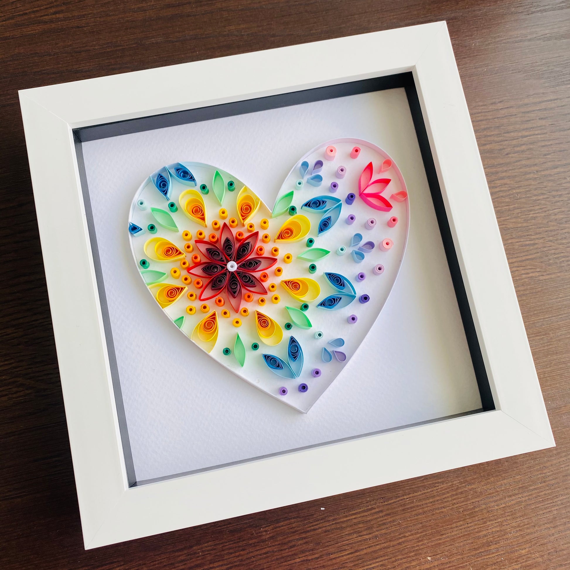 Rainbow Mandala Heart quilling art that makes a great gift. Text can be added around the design at no extra charge.