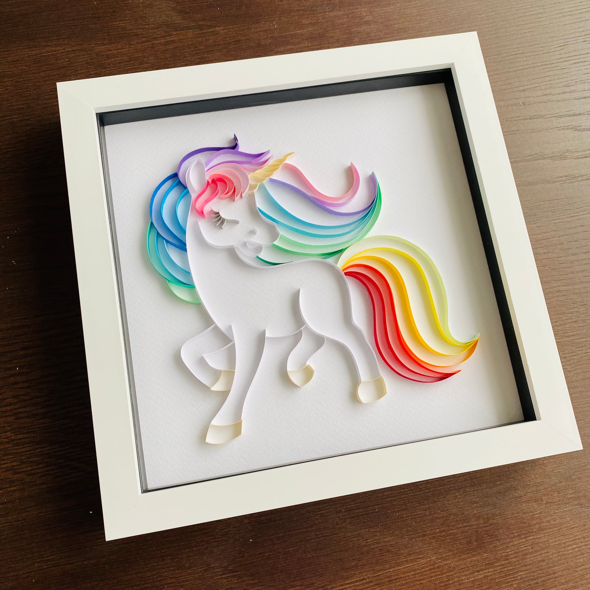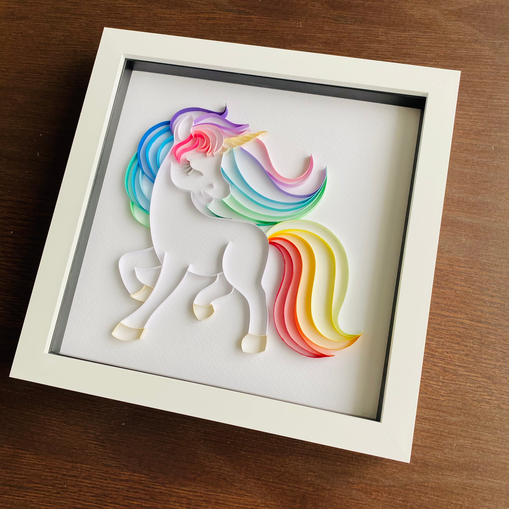 Rainbow unicorn quilling art that makes a great gift. Text can be added around the design at no extra charge.