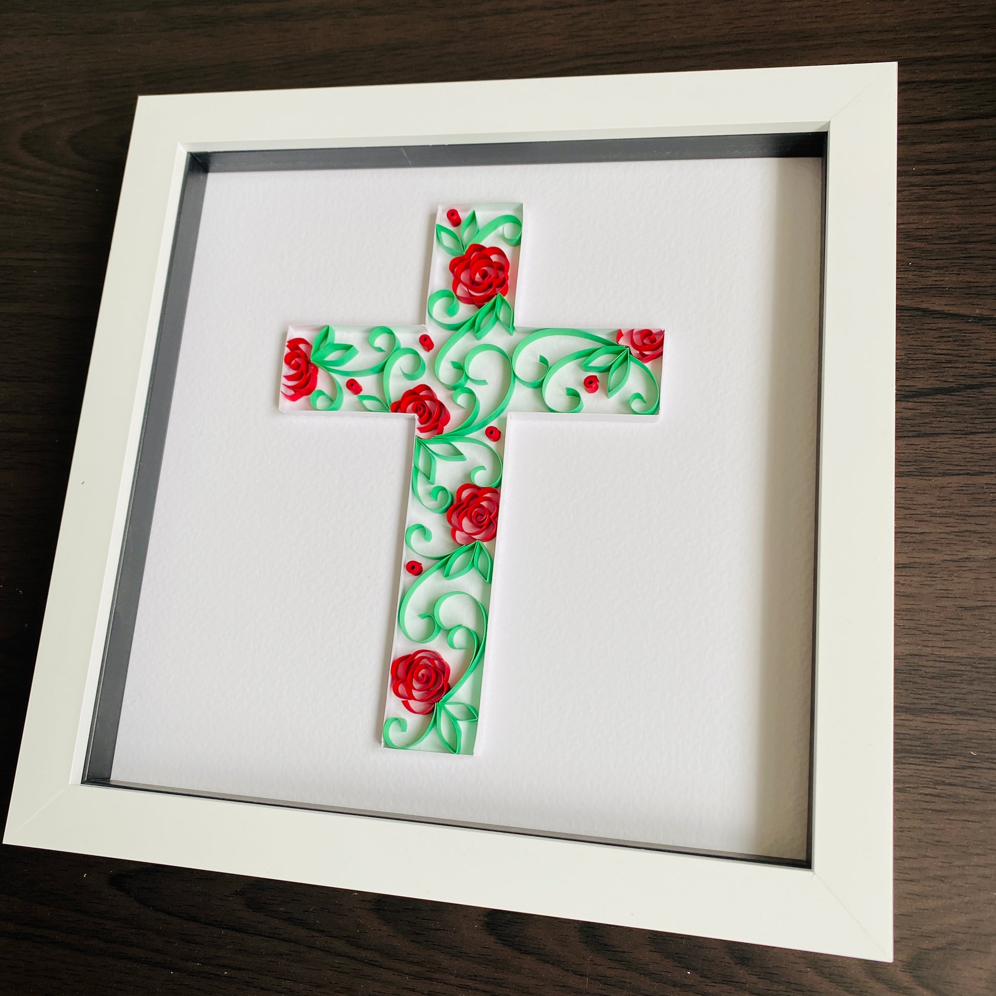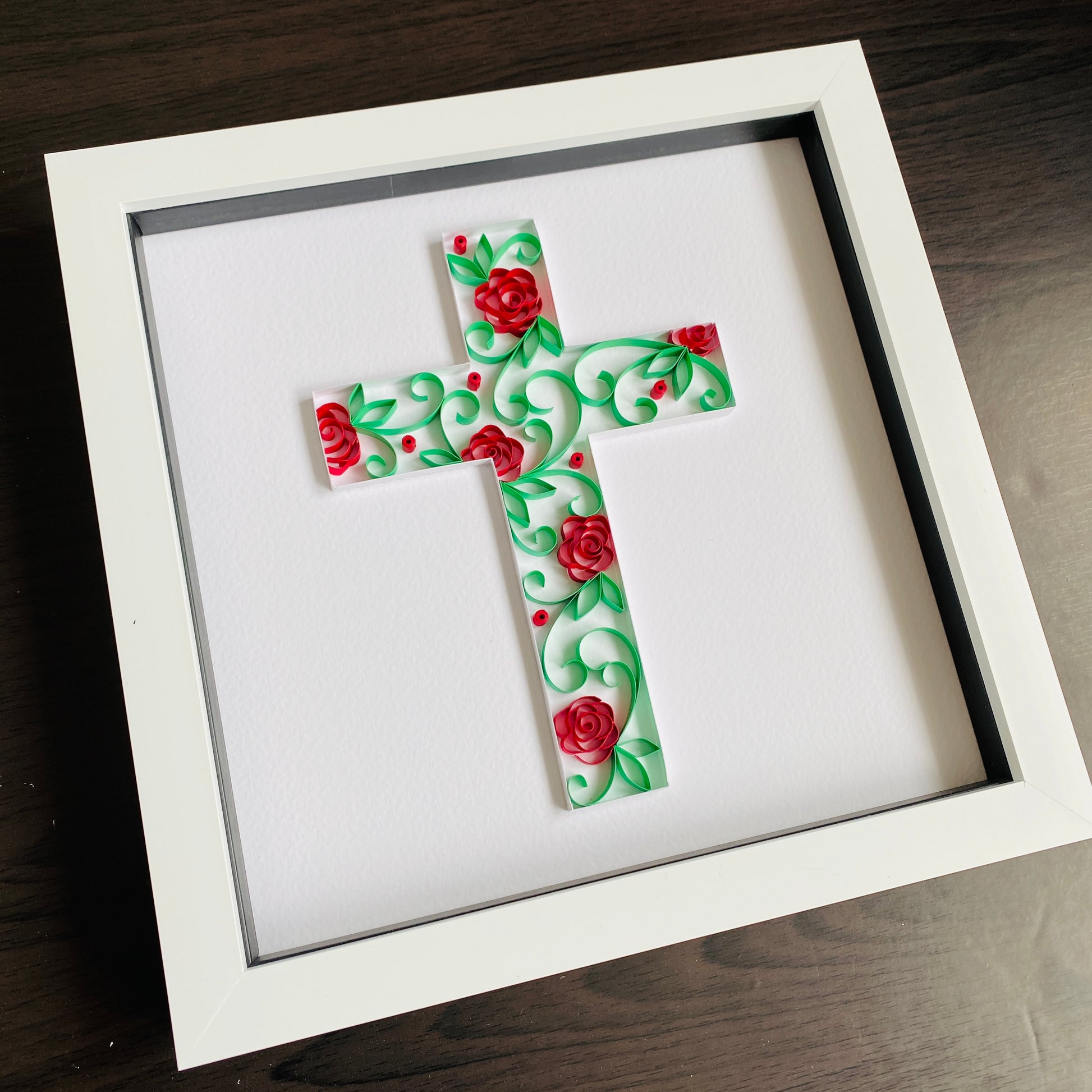 Quilled rose cross that makes a great gift for a confirmation or christening. Text can be added below the design at no extra charge.