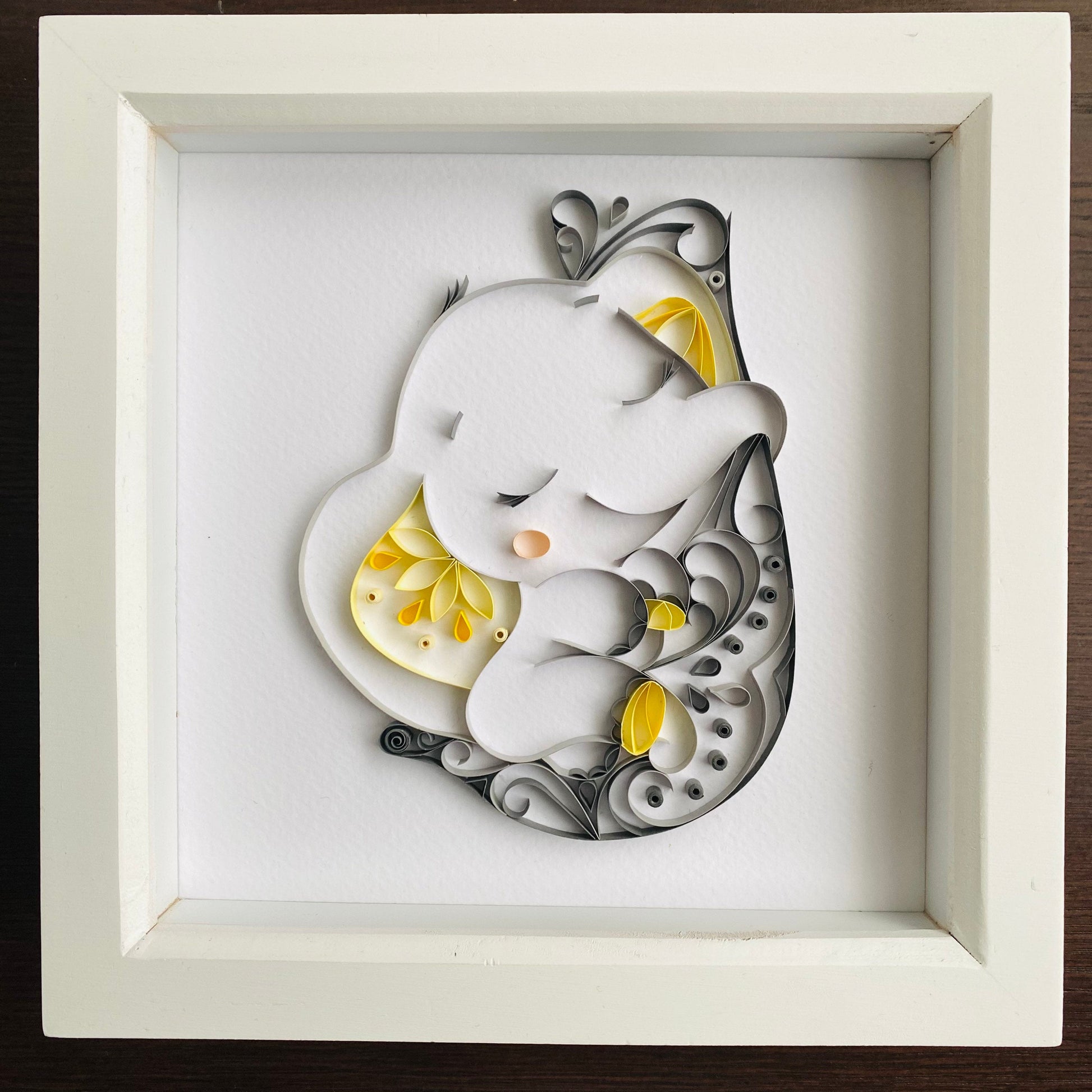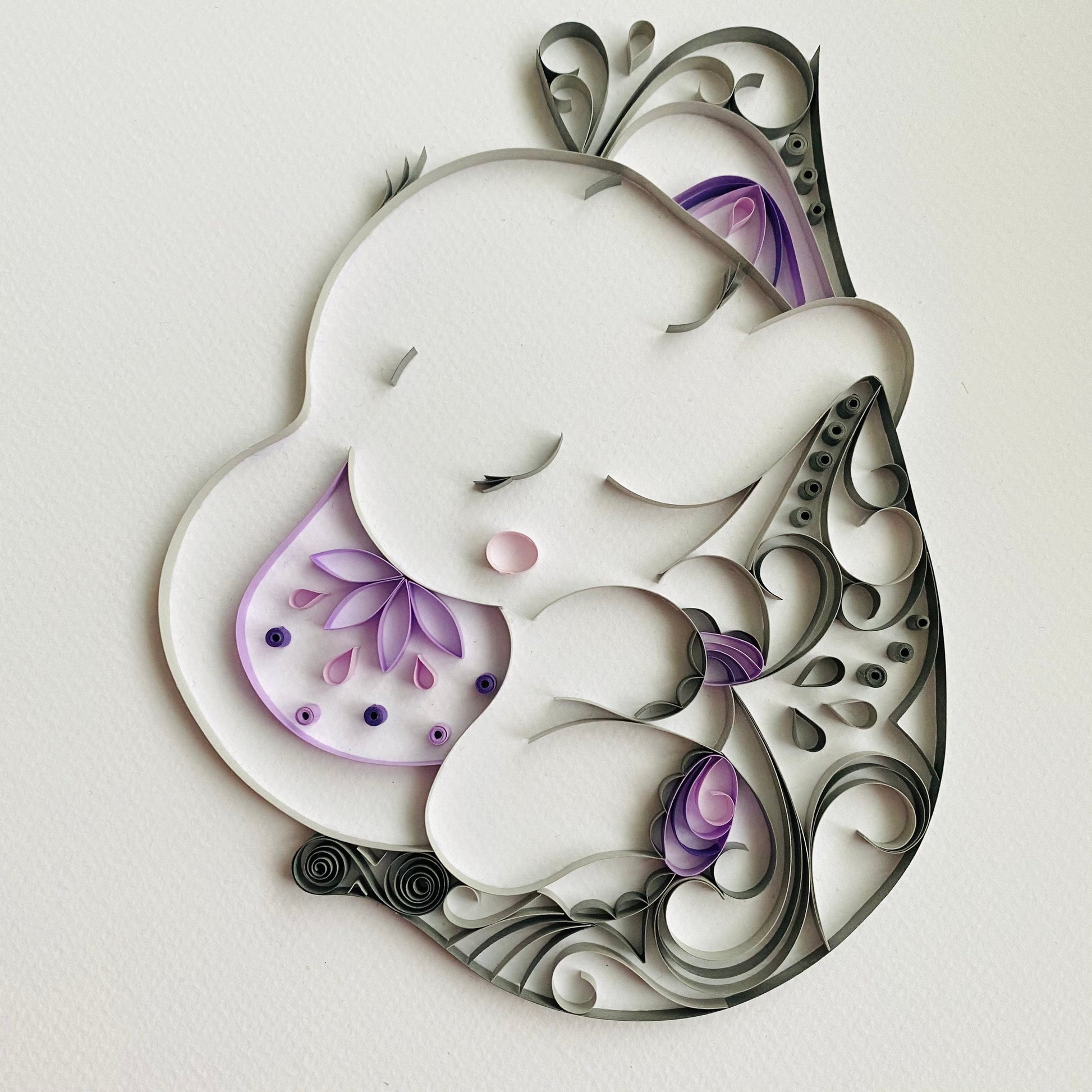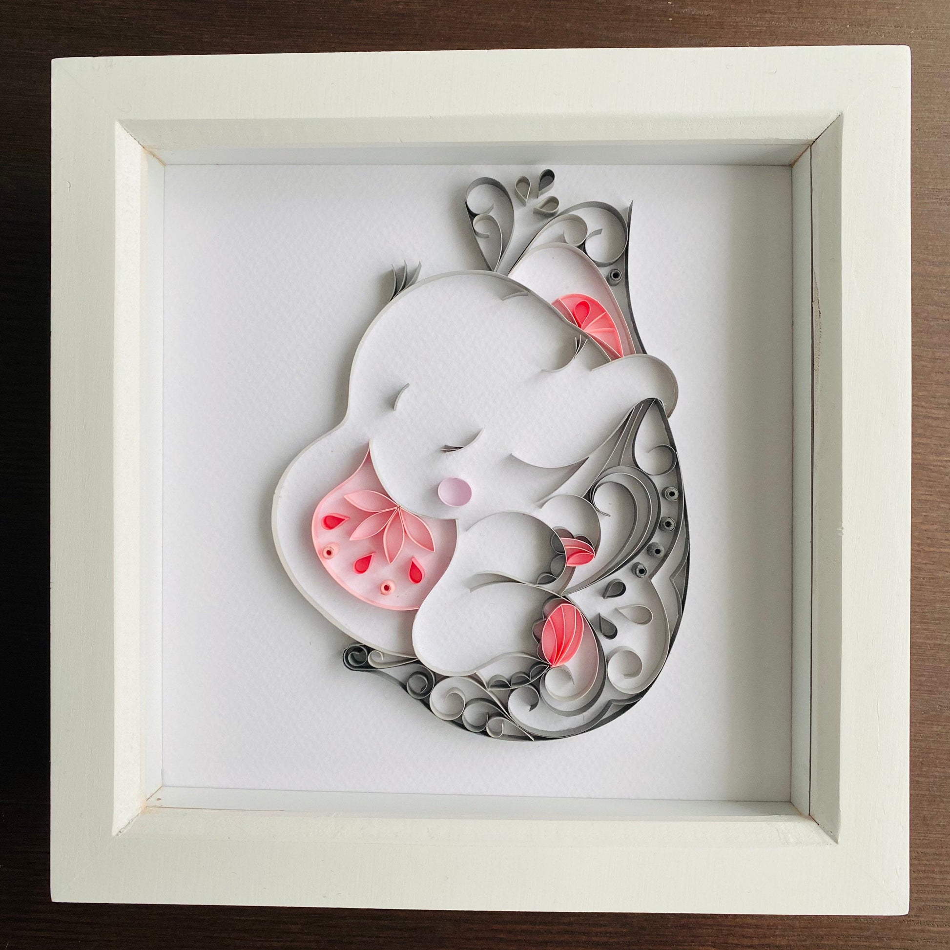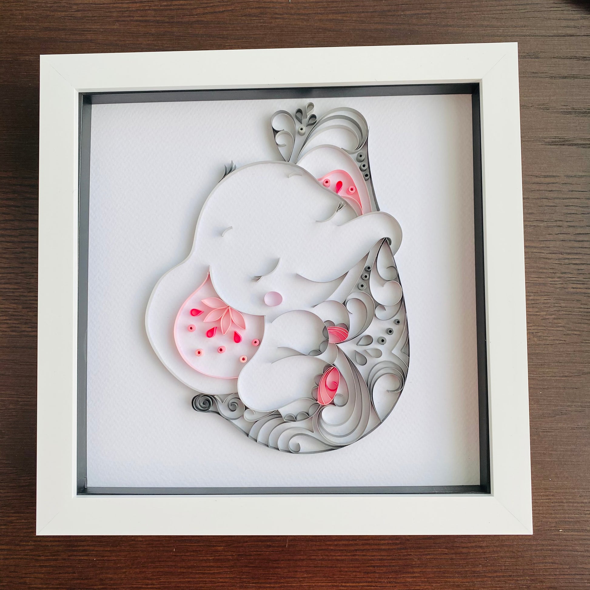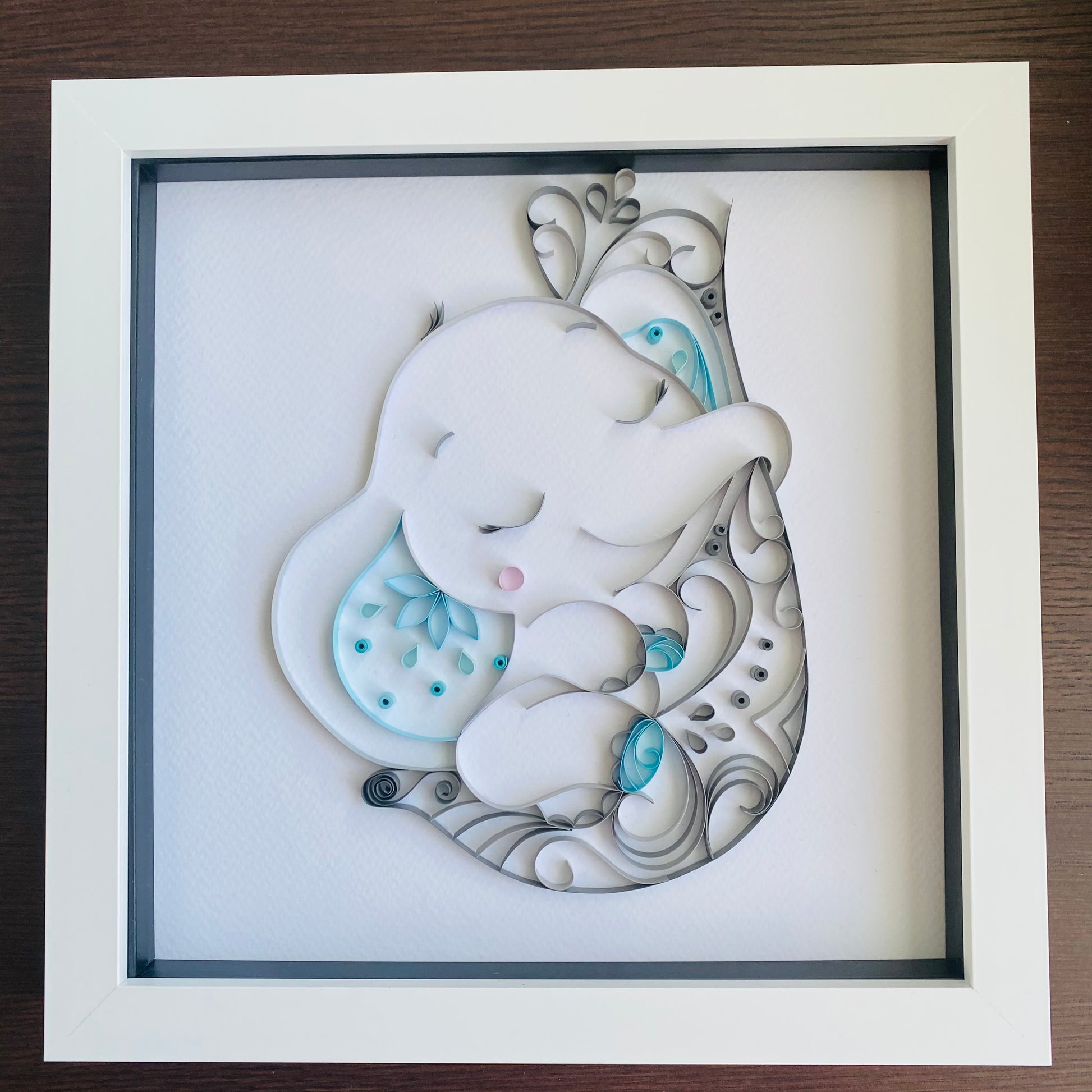 Original piece of quilling art baby elephant that makes a great gift. Text can be added around it at no extra charge.